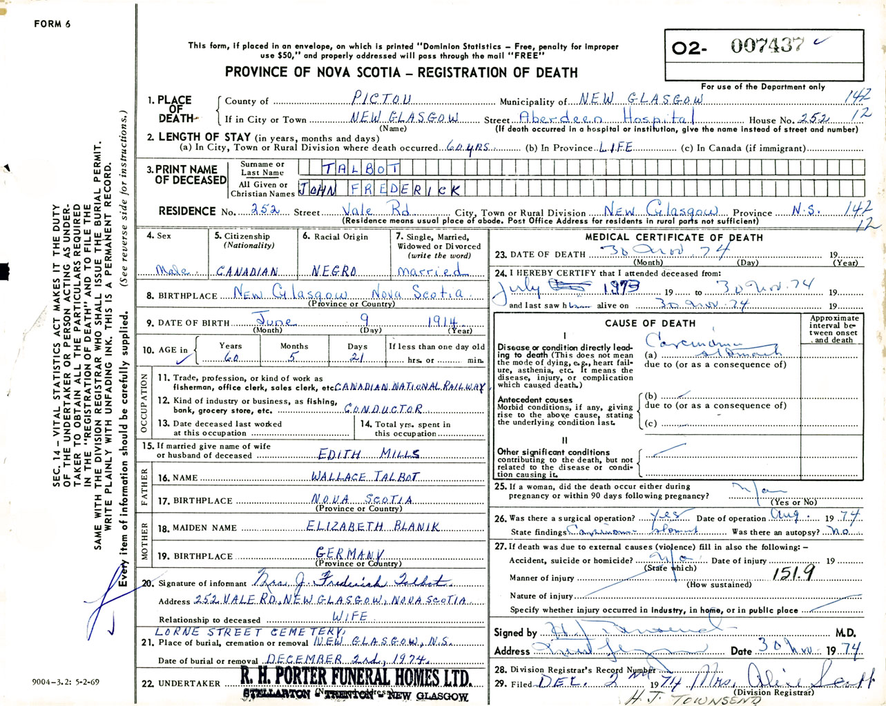 Male Death Registration: Year: 1974 number: 7437