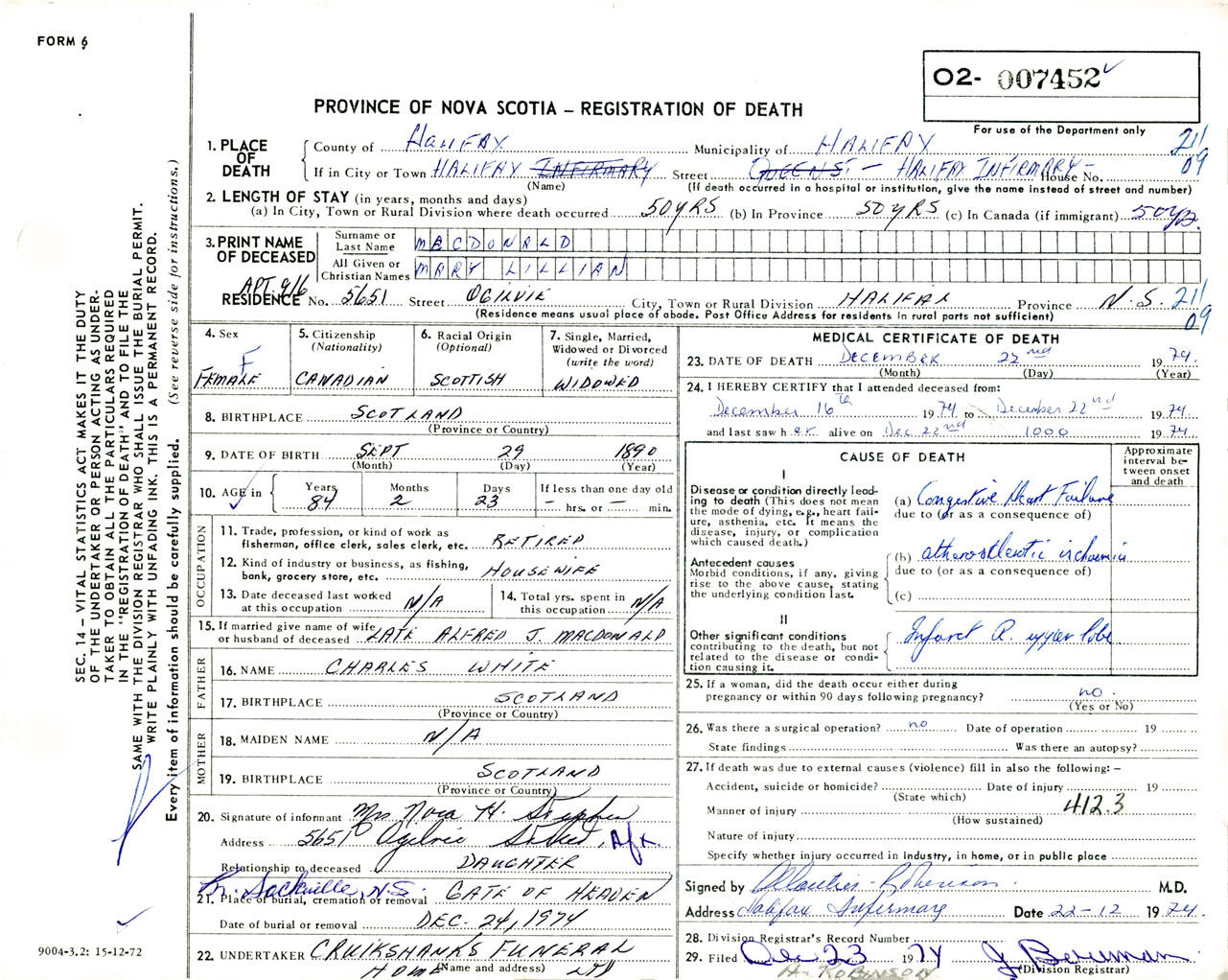 Female Death Registration: Year: 1974 number: 7452