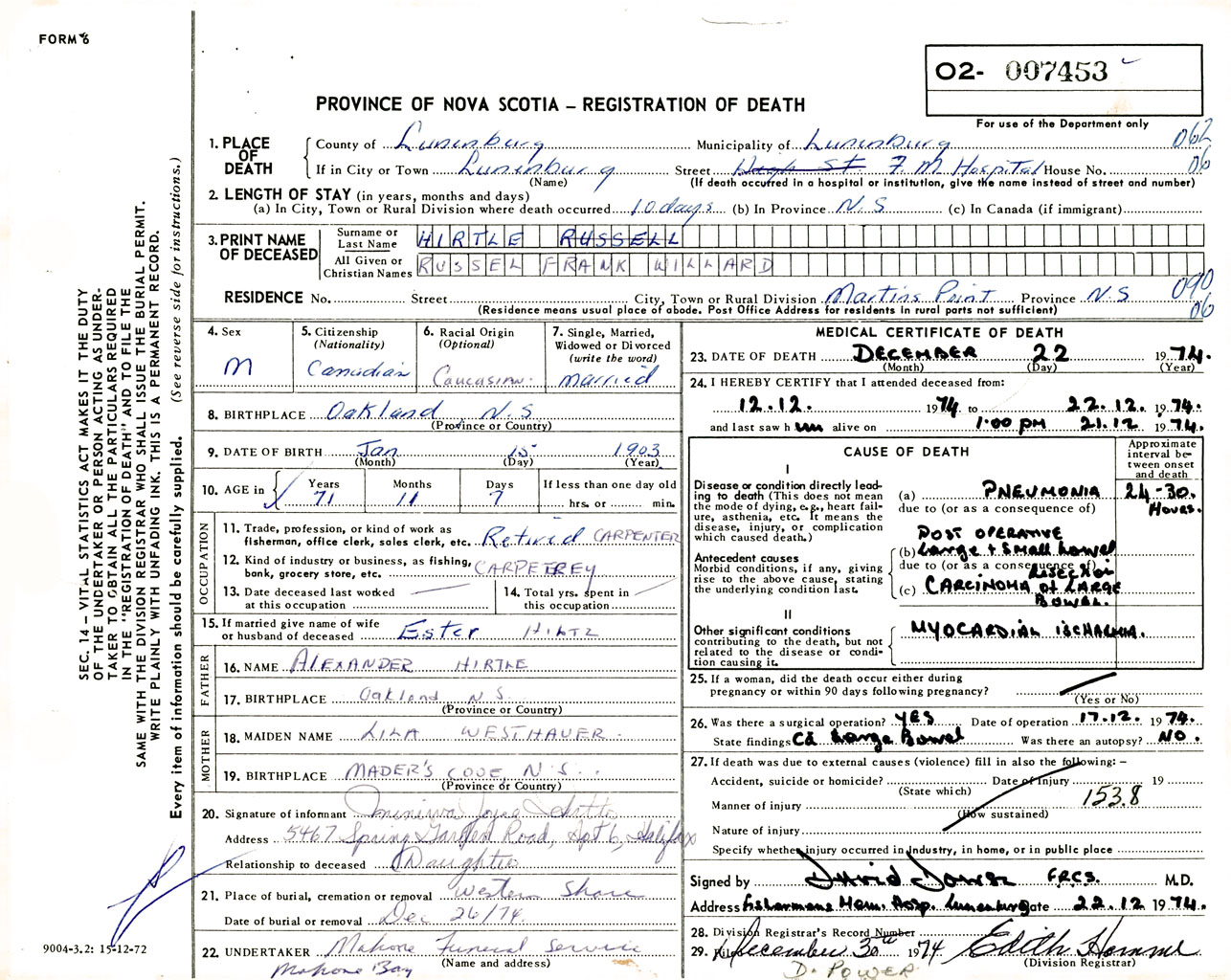 Male Death Registration: Year: 1974 number: 7453