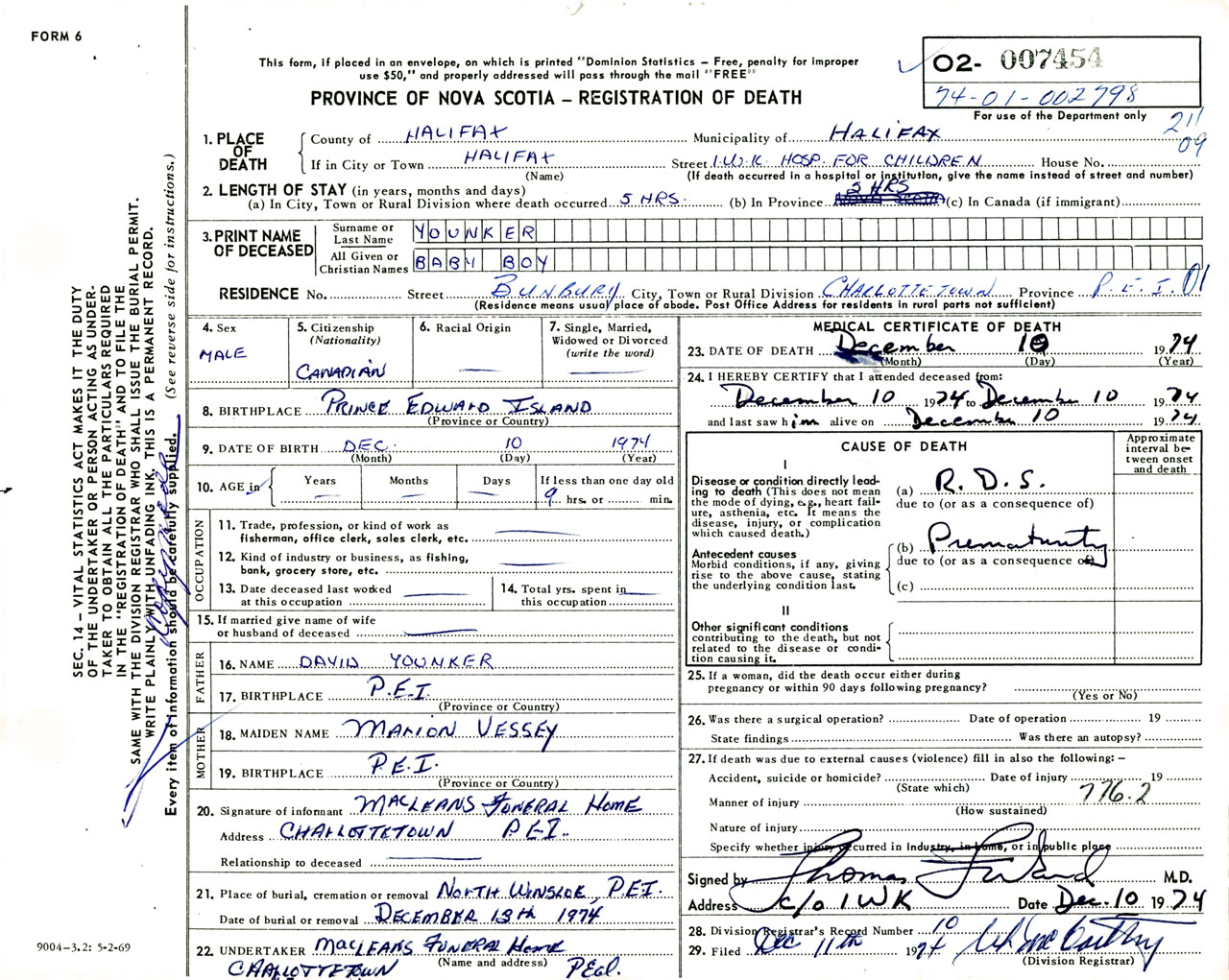 Male Death Registration: Year: 1974 number: 7454