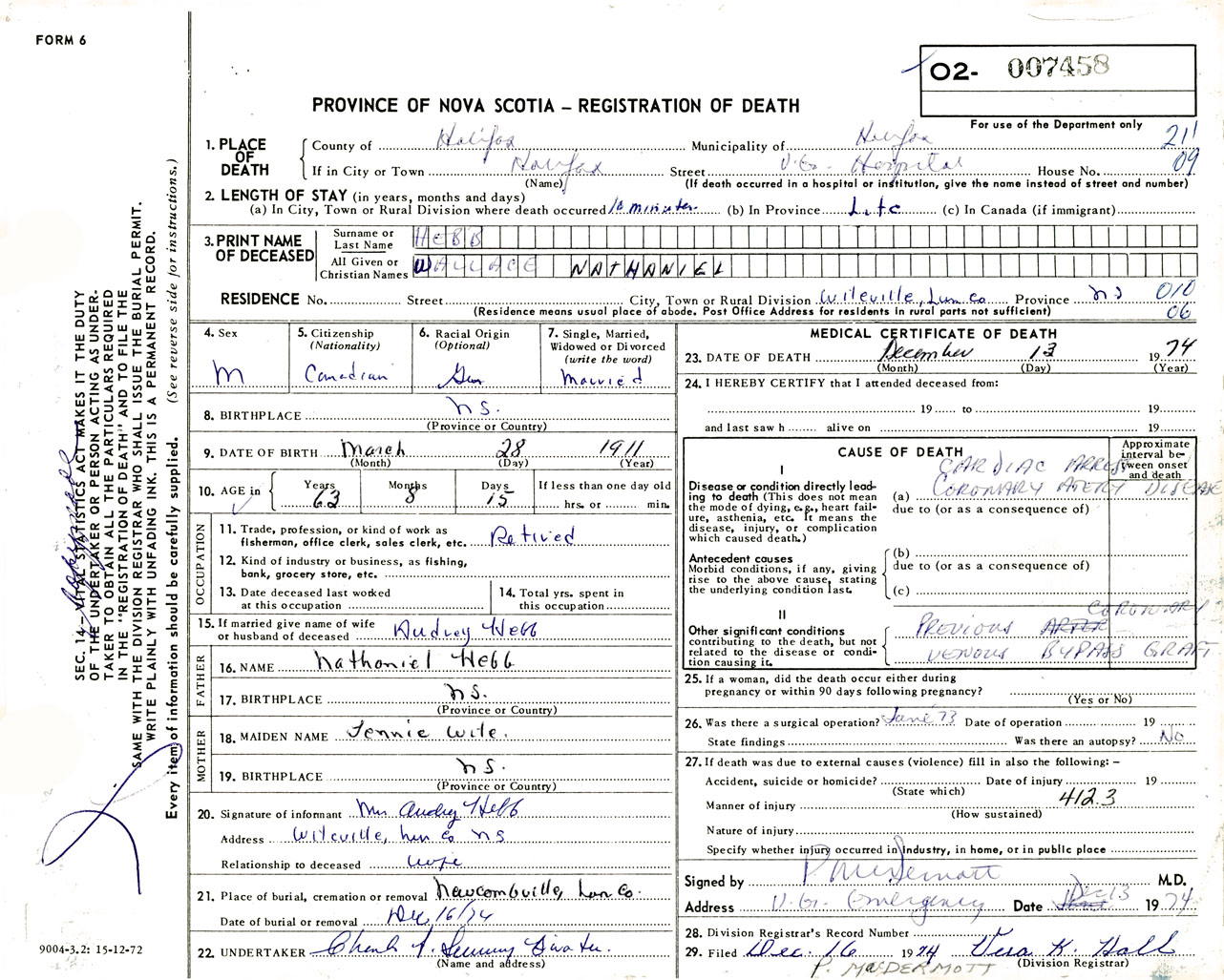 Male Death Registration: Year: 1974 number: 7458