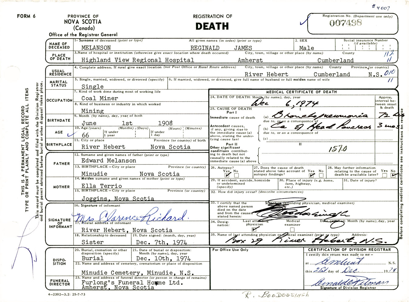 Male Death Registration: Year: 1974 number: 7498