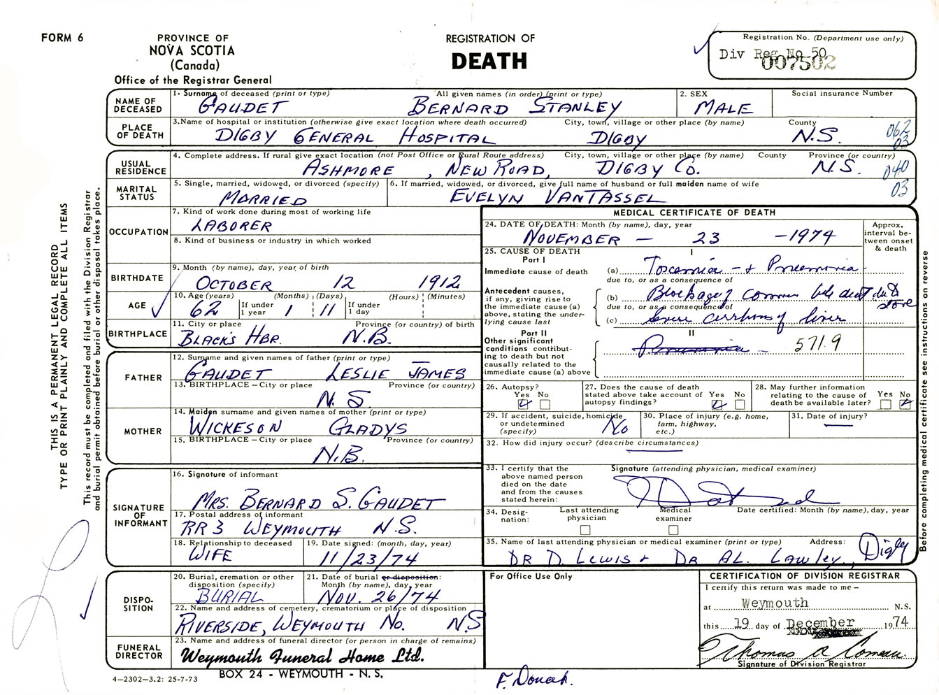 Male Death Registration: Year: 1974 number: 7502