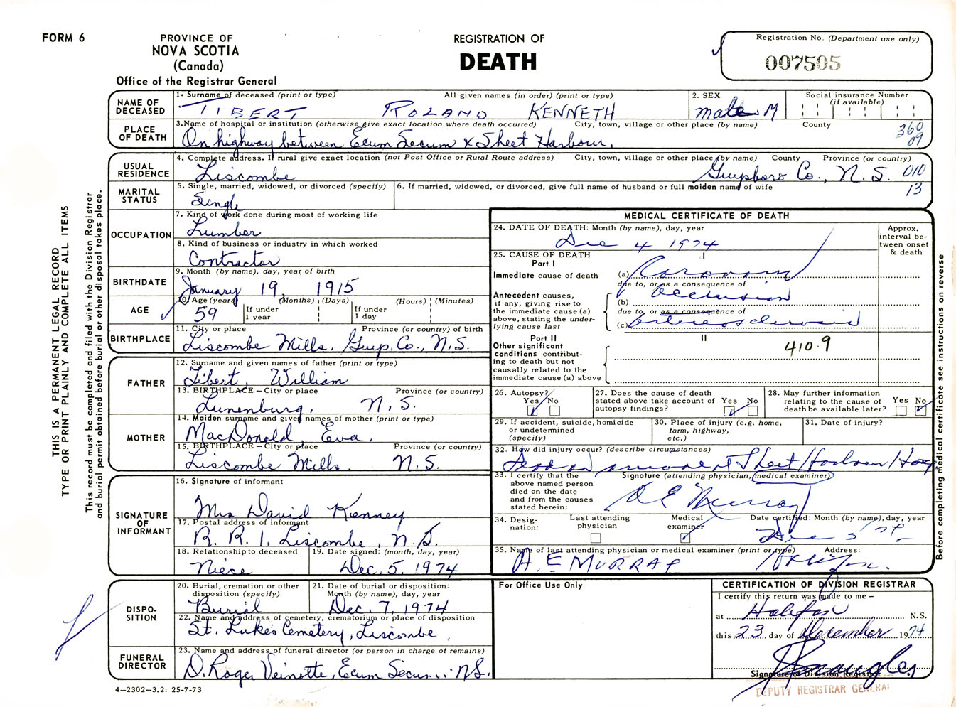 Male Death Registration: Year: 1974 number: 7505