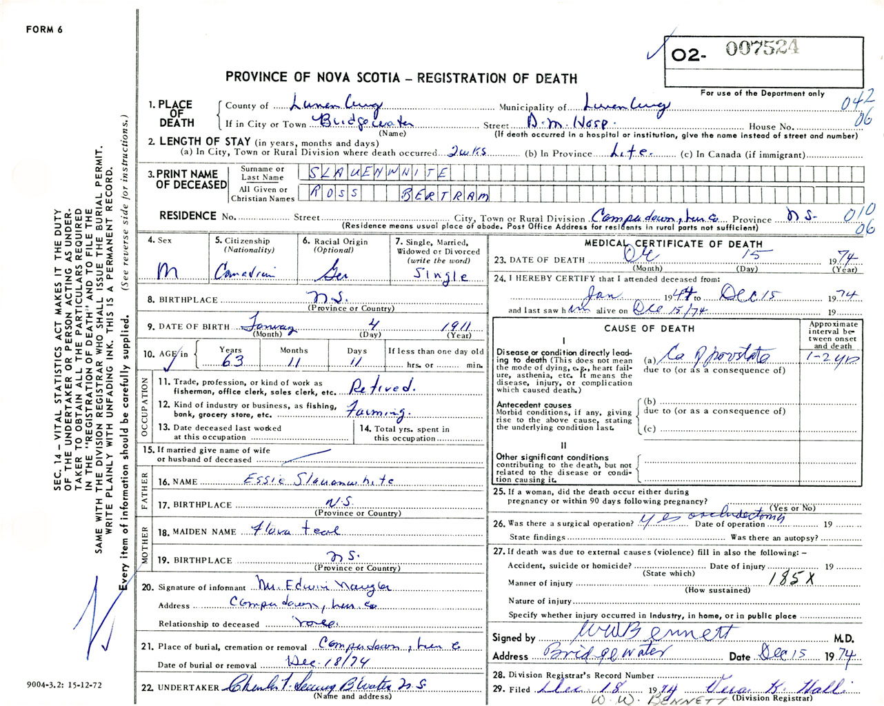 Male Death Registration: Year: 1974 number: 7524