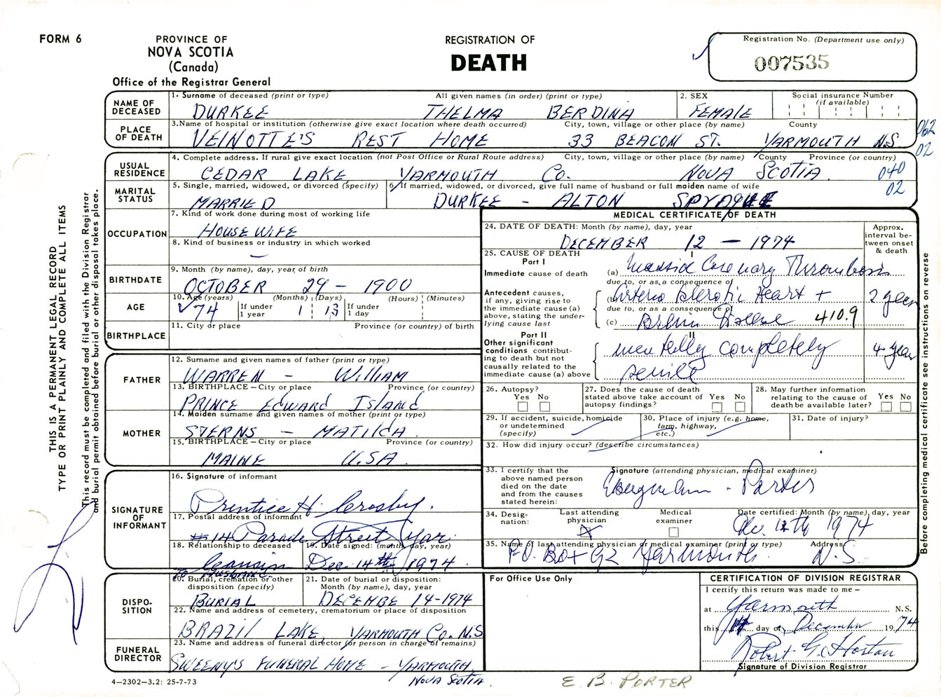 Female Death Registration: Year: 1974 number: 7535