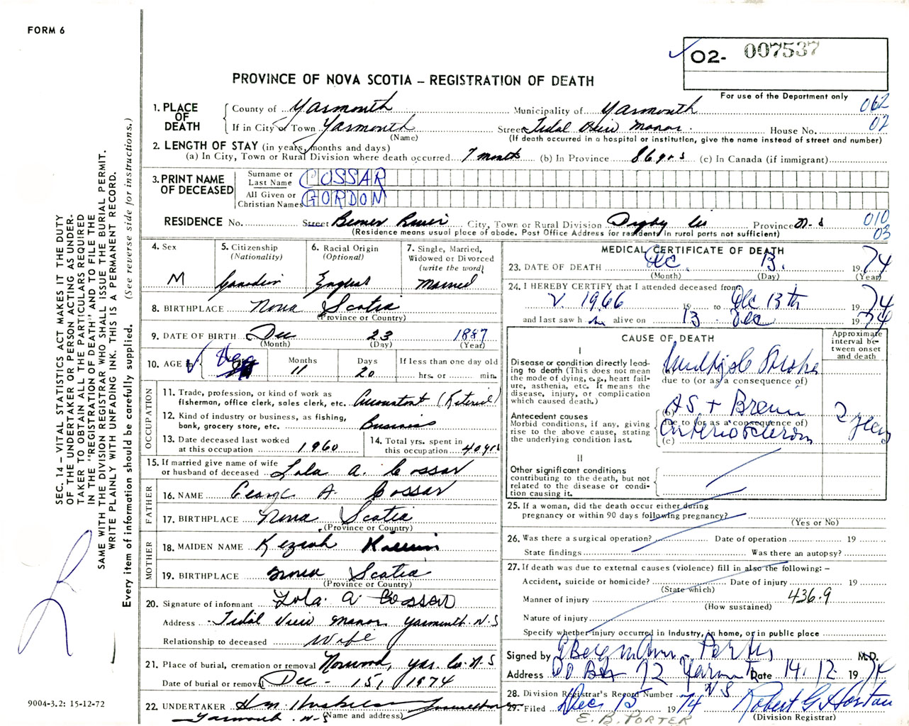 Male Death Registration: Year: 1974 number: 7537