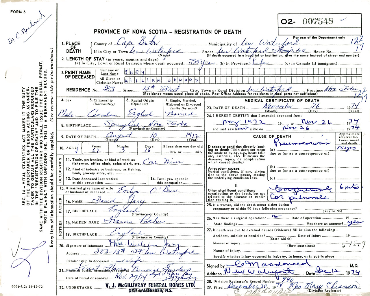 Male Death Registration: Year: 1974 number: 7548