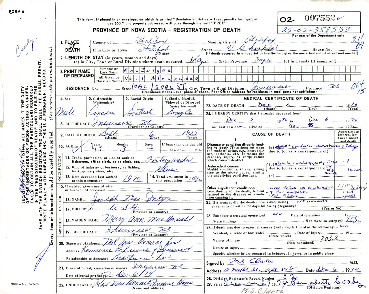 Male Death Registration: Year: 1974 number: 7552