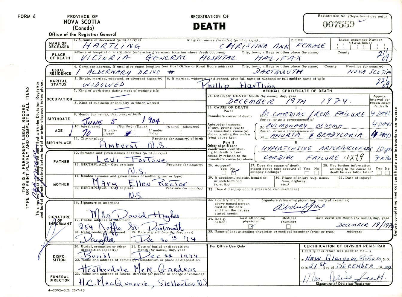 Female Death Registration: Year: 1974 number: 7559
