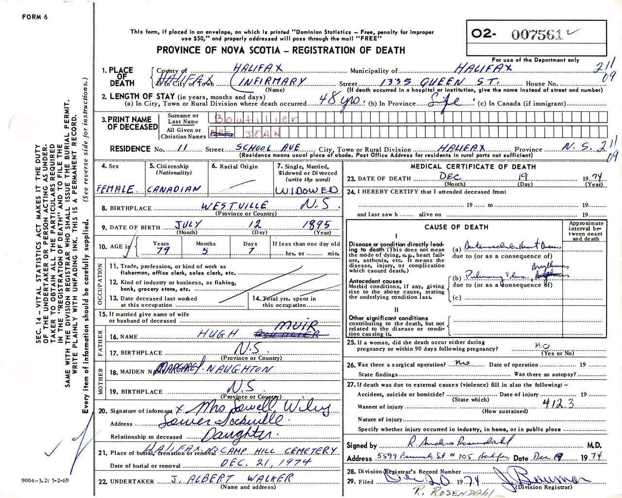 Female Death Registration: Year: 1974 number: 7561
