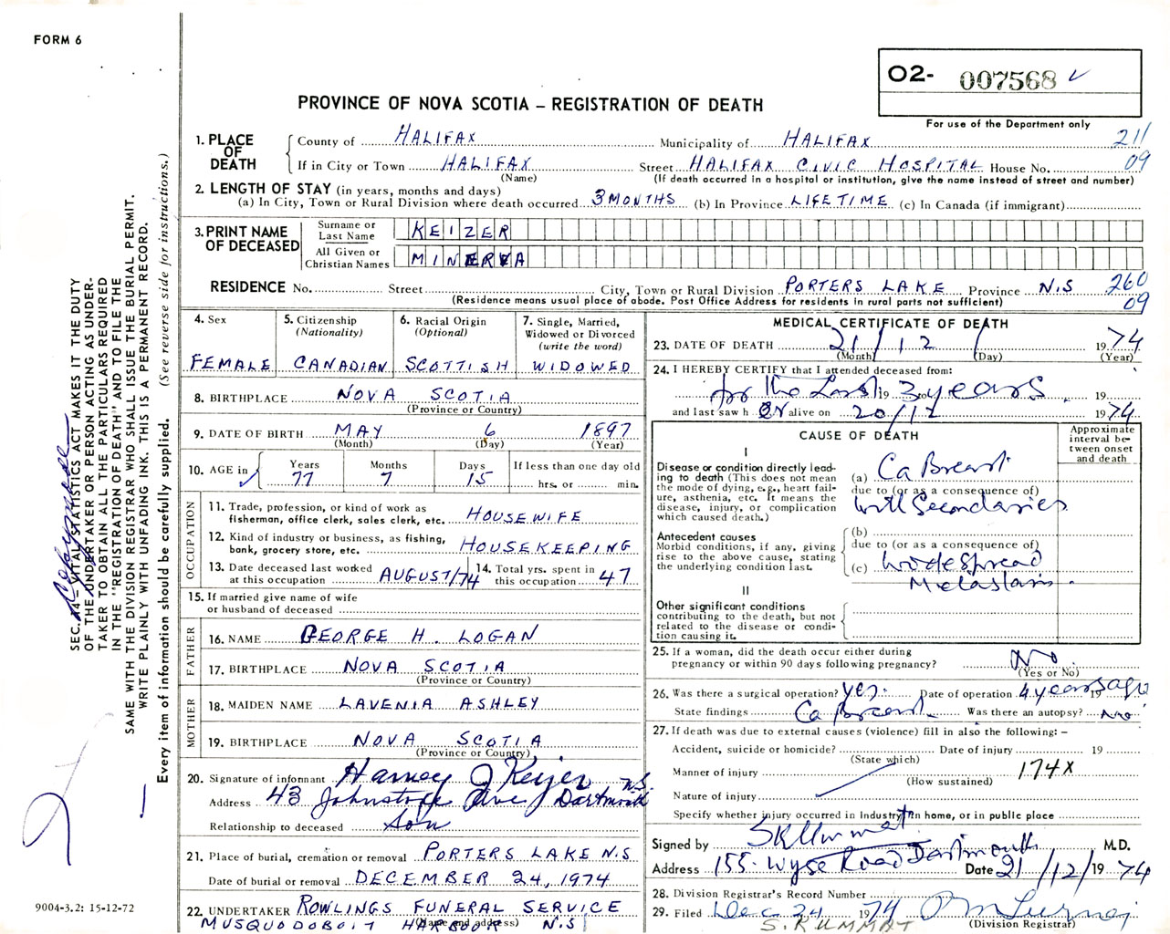 Female Death Registration: Year: 1974 number: 7568