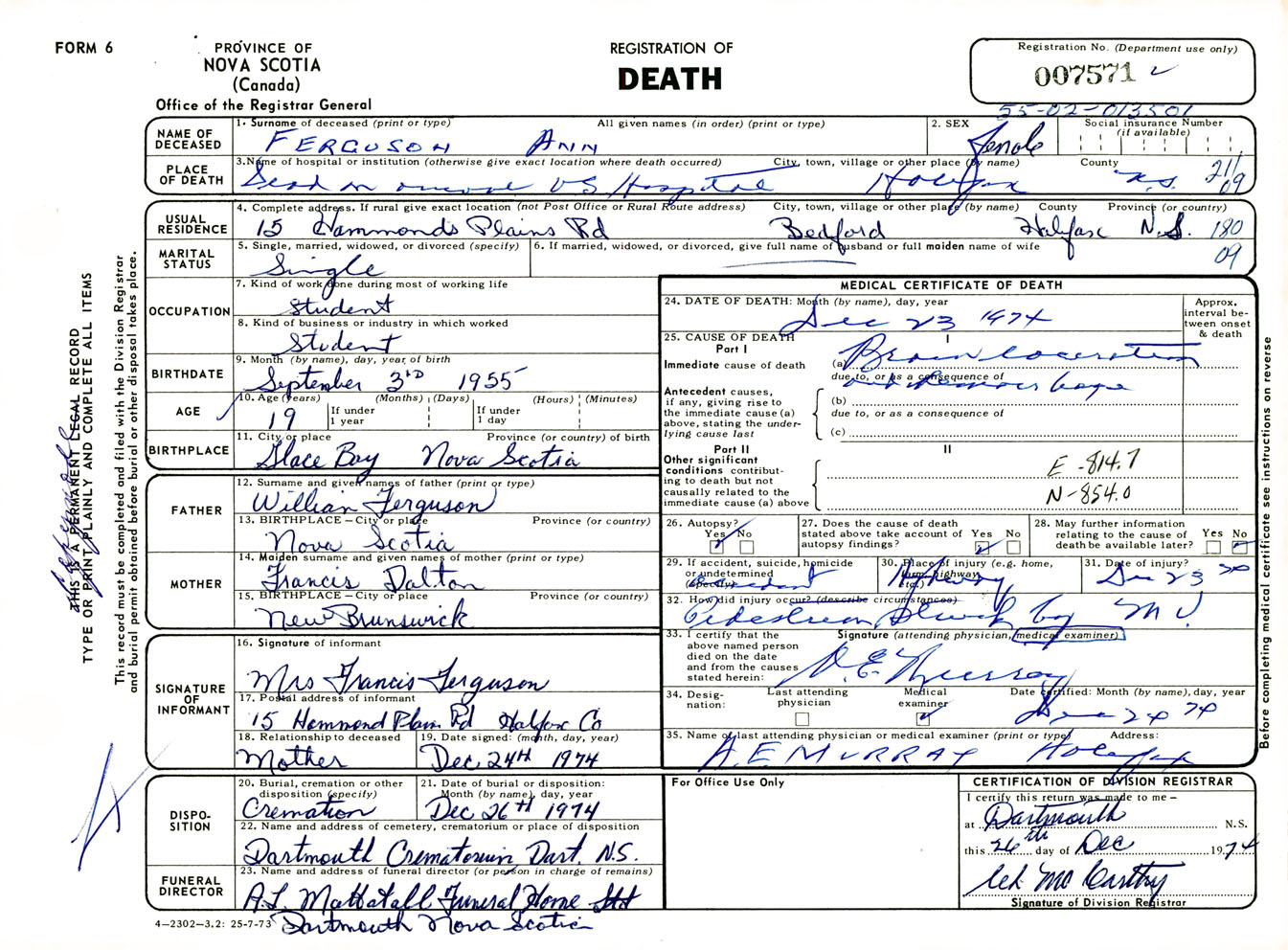 Female Death Registration: Year: 1974 number: 7571