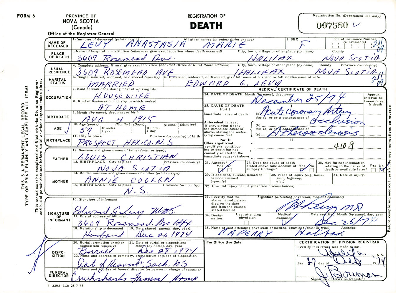Female Death Registration: Year: 1974 number: 7580