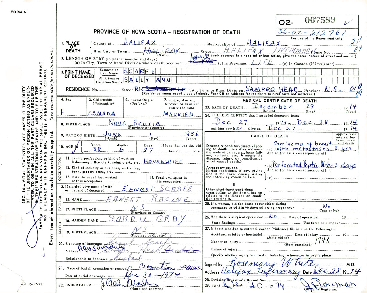 Female Death Registration: Year: 1974 number: 7589