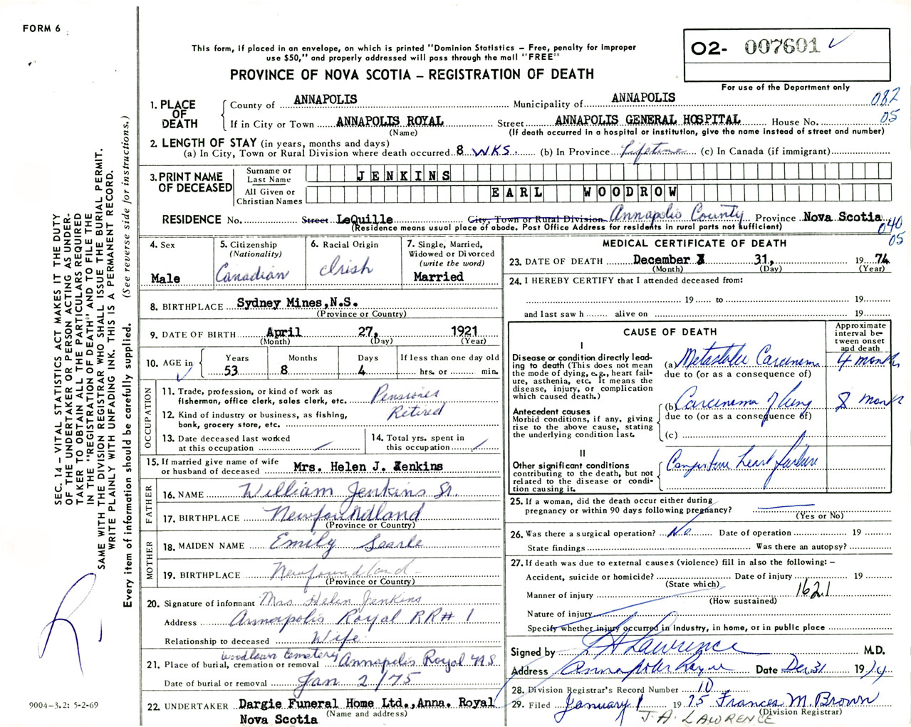 Male Death Registration: Year: 1974 number: 7601