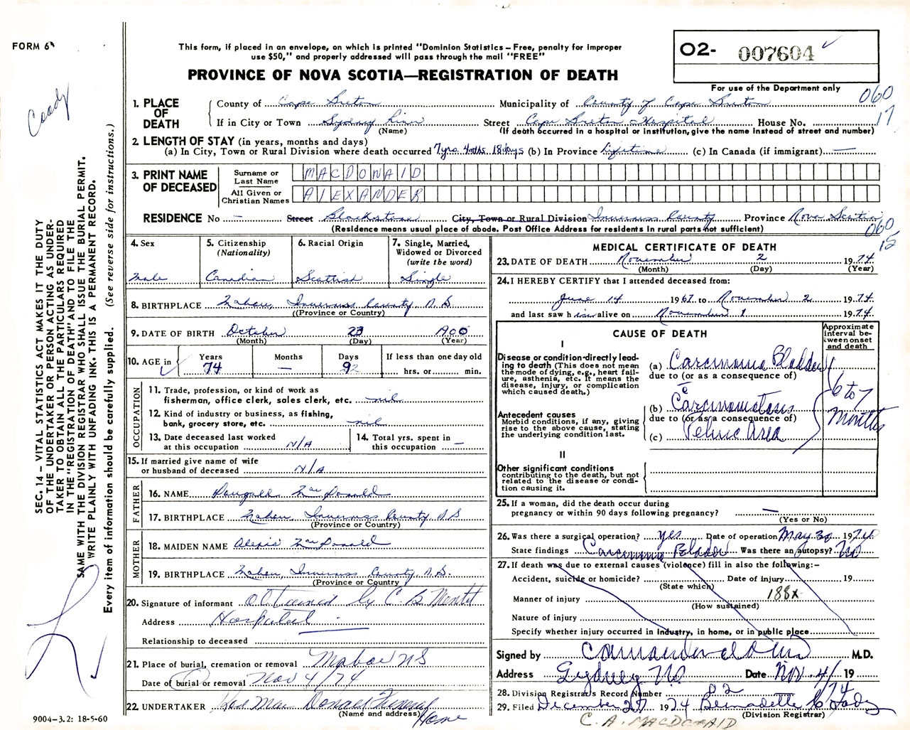 Male Death Registration: Year: 1974 number: 7604