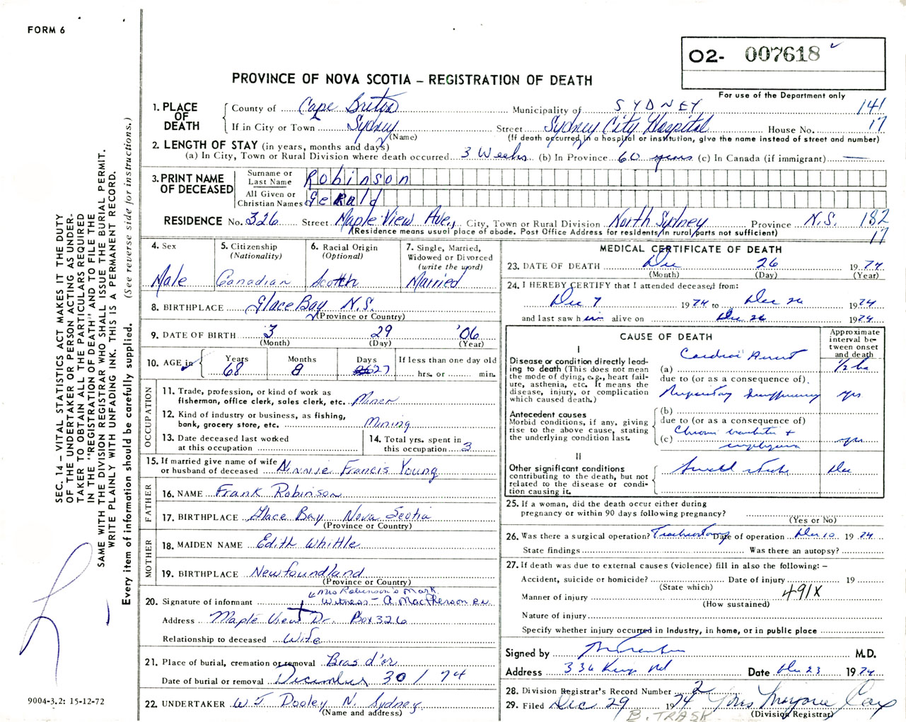Male Death Registration: Year: 1974 number: 7618