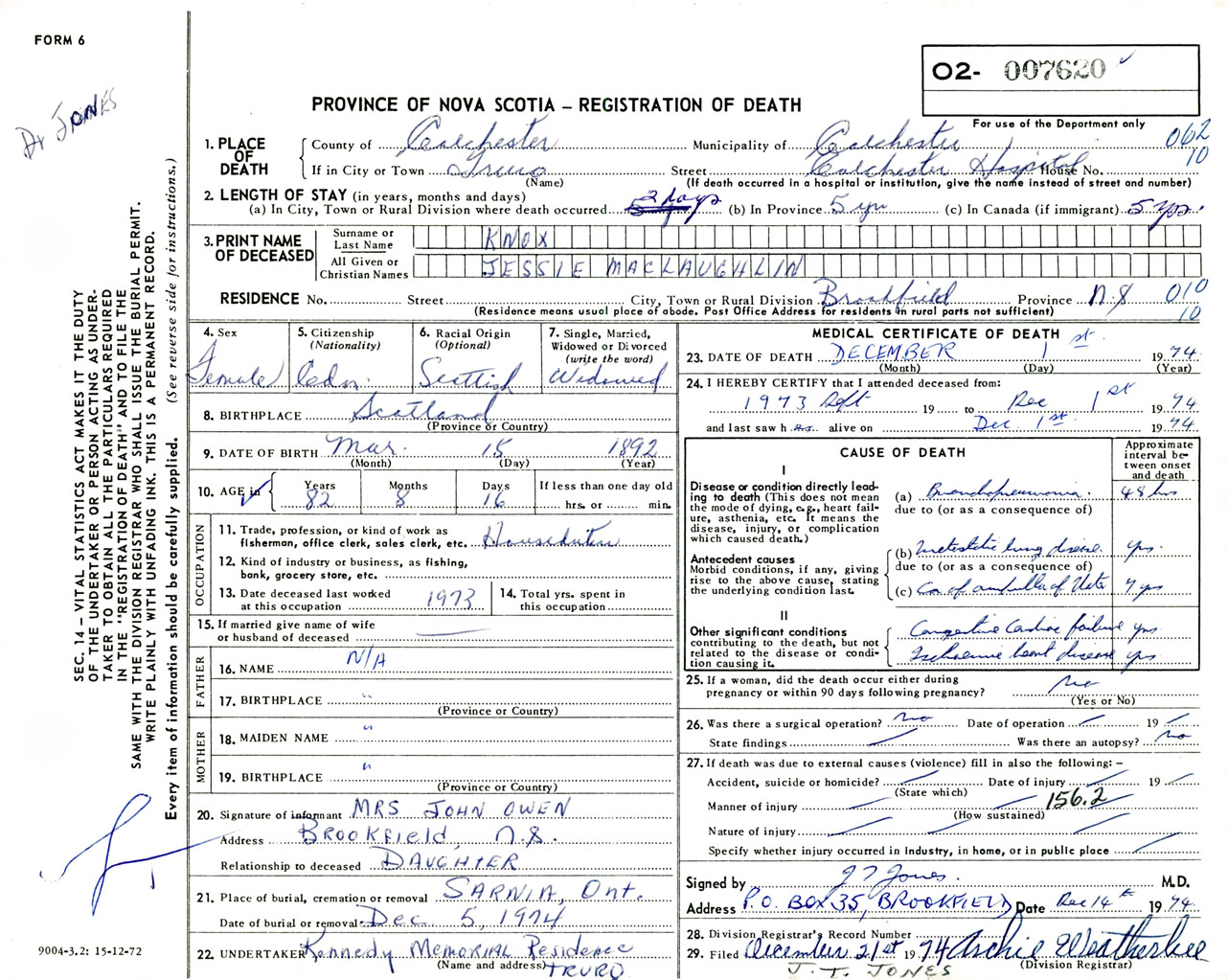 Female Death Registration: Year: 1974 number: 7620