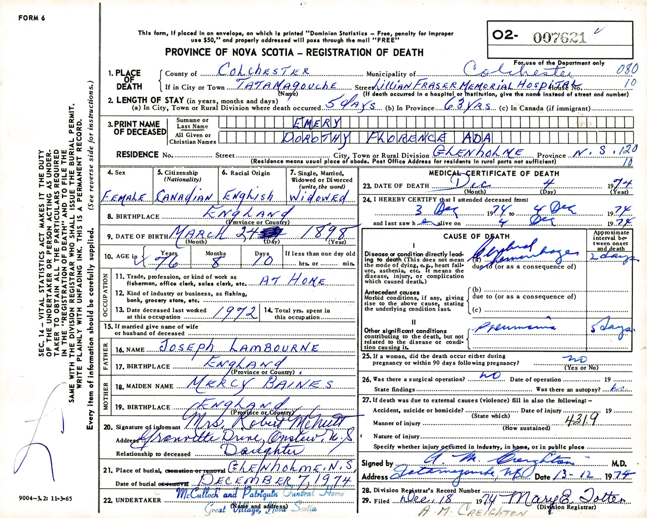 Female Death Registration: Year: 1974 number: 7621