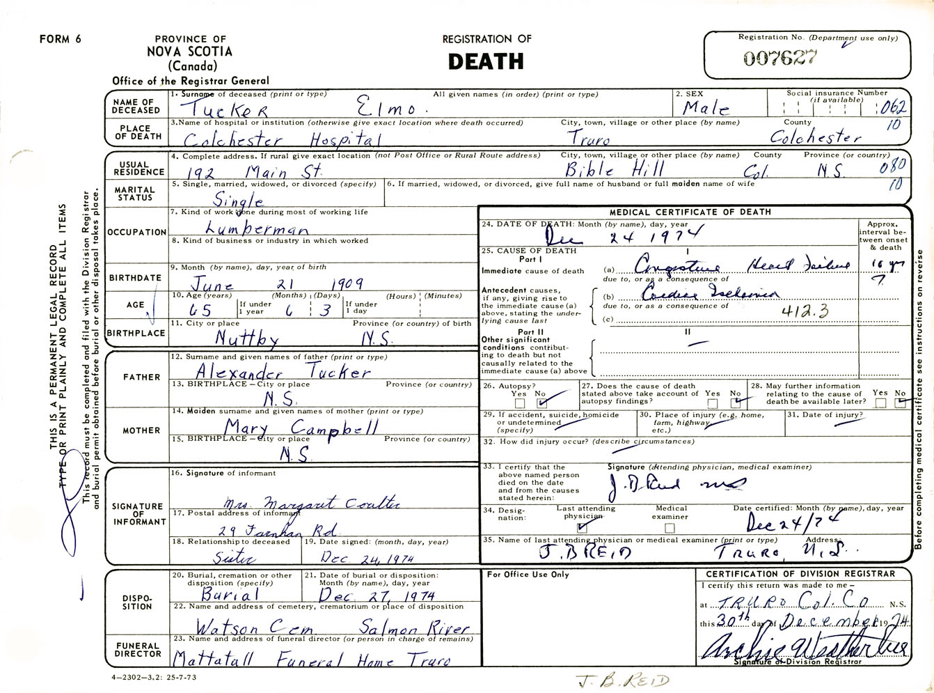 Male Death Registration: Year: 1974 number: 7627