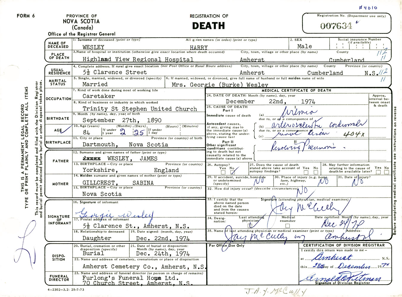 Male Death Registration: Year: 1974 number: 7634