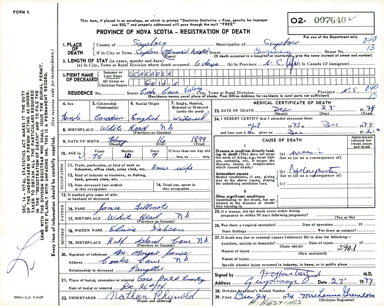 Female Death Registration: Year: 1974 number: 7640