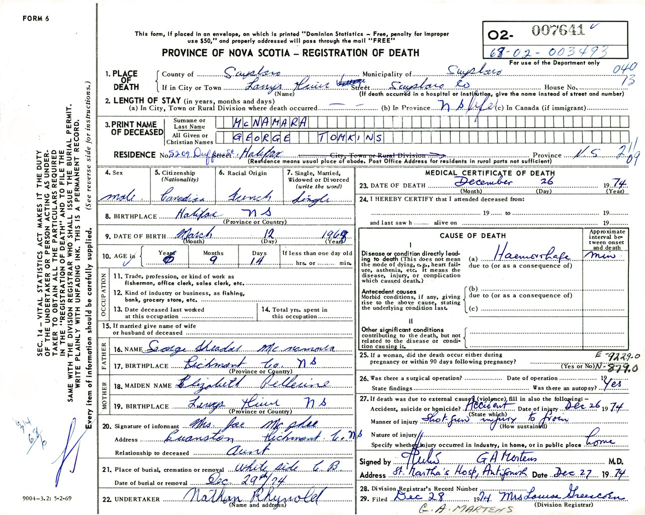 Male Death Registration: Year: 1974 number: 7641