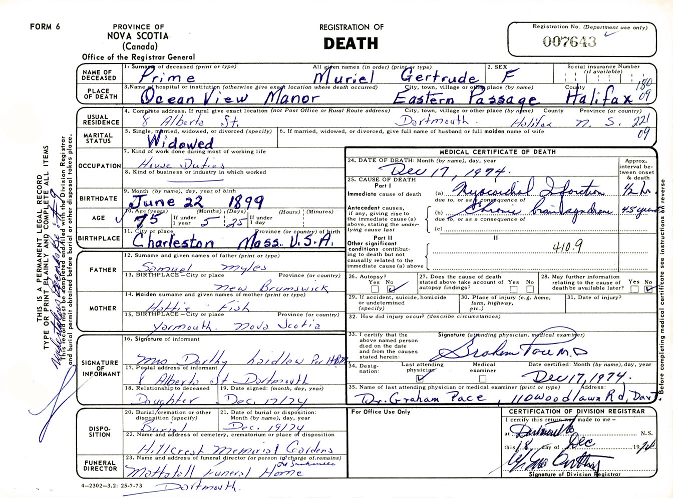 Female Death Registration: Year: 1974 number: 7643
