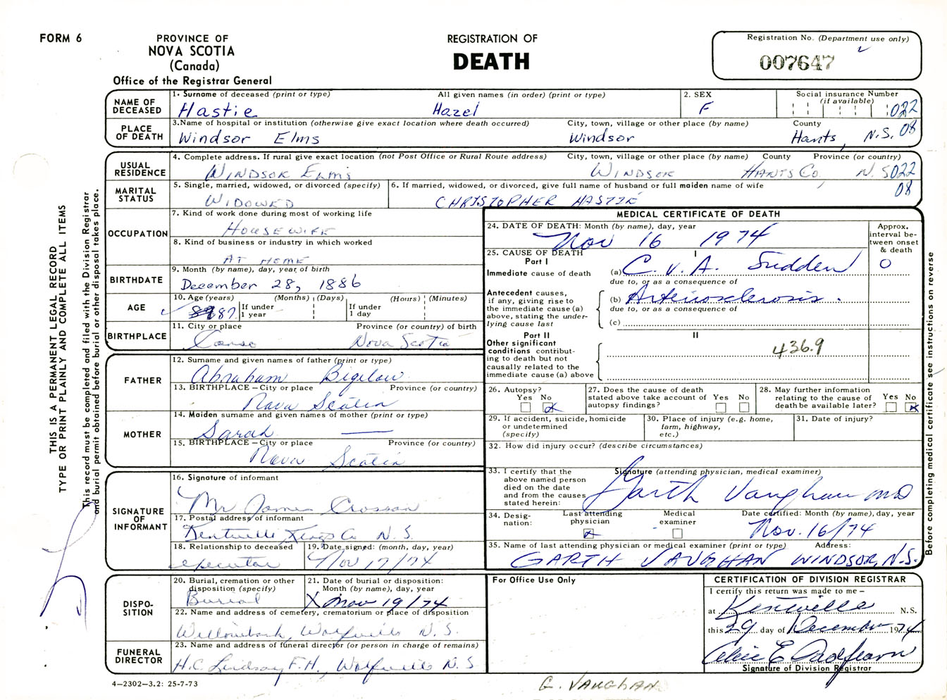 Female Death Registration: Year: 1974 number: 7647
