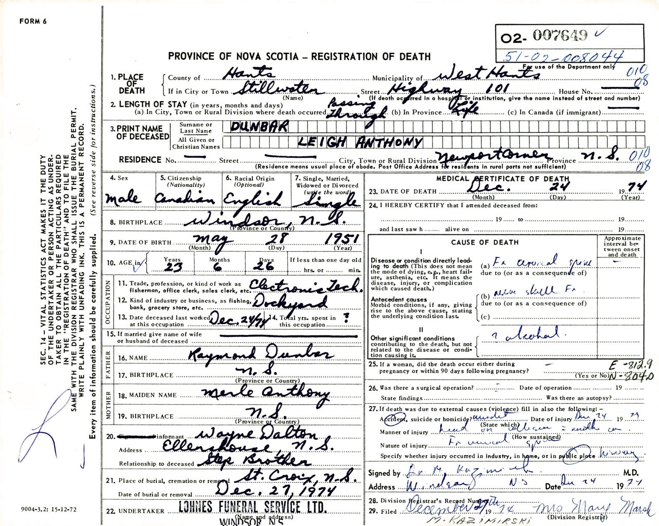 Male Death Registration: Year: 1974 number: 7649