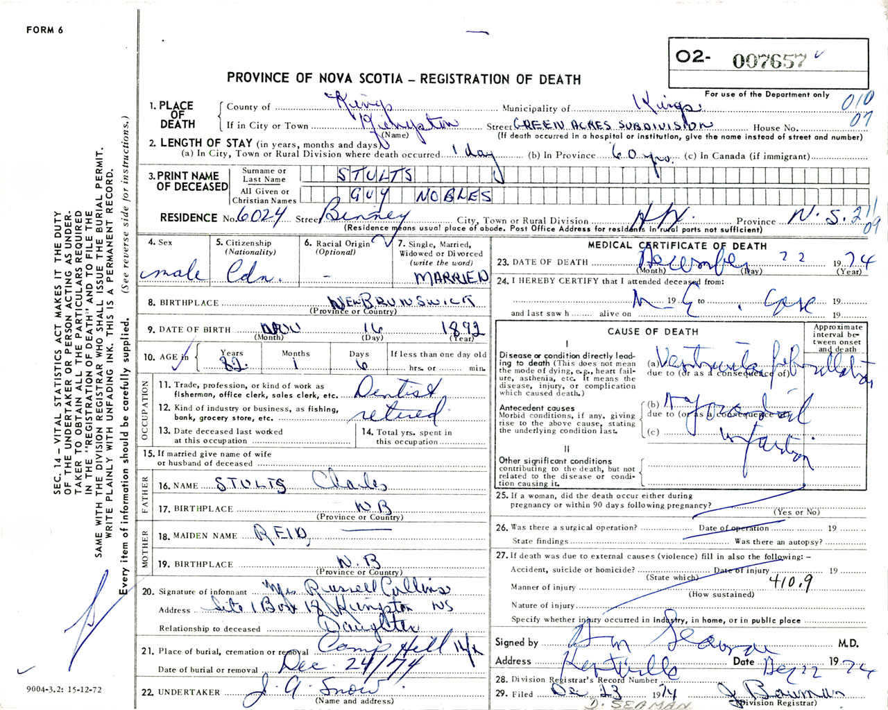 Male Death Registration: Year: 1974 number: 7657
