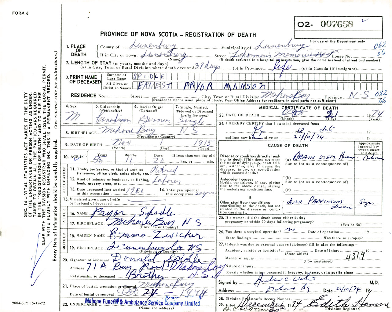 Male Death Registration: Year: 1974 number: 7658