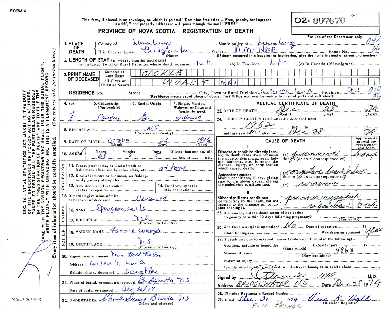 Female Death Registration: Year: 1974 number: 7670