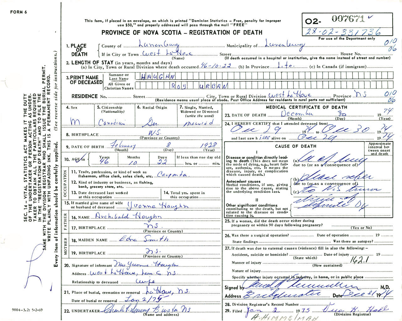 Male Death Registration: Year: 1974 number: 7671