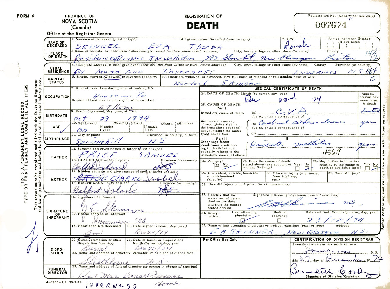 Female Death Registration: Year: 1974 number: 7674