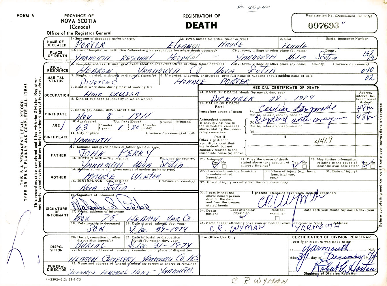 Female Death Registration: Year: 1974 number: 7693