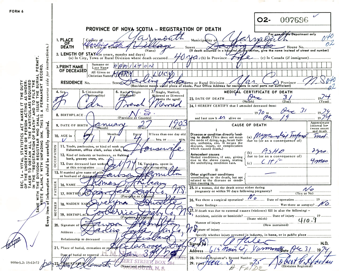 Female Death Registration: Year: 1974 number: 7696