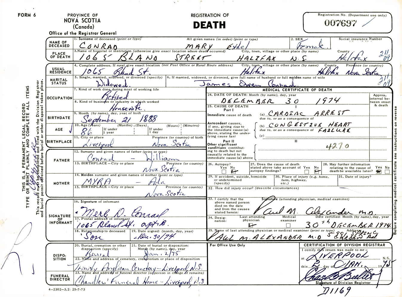 Female Death Registration: Year: 1974 number: 7697