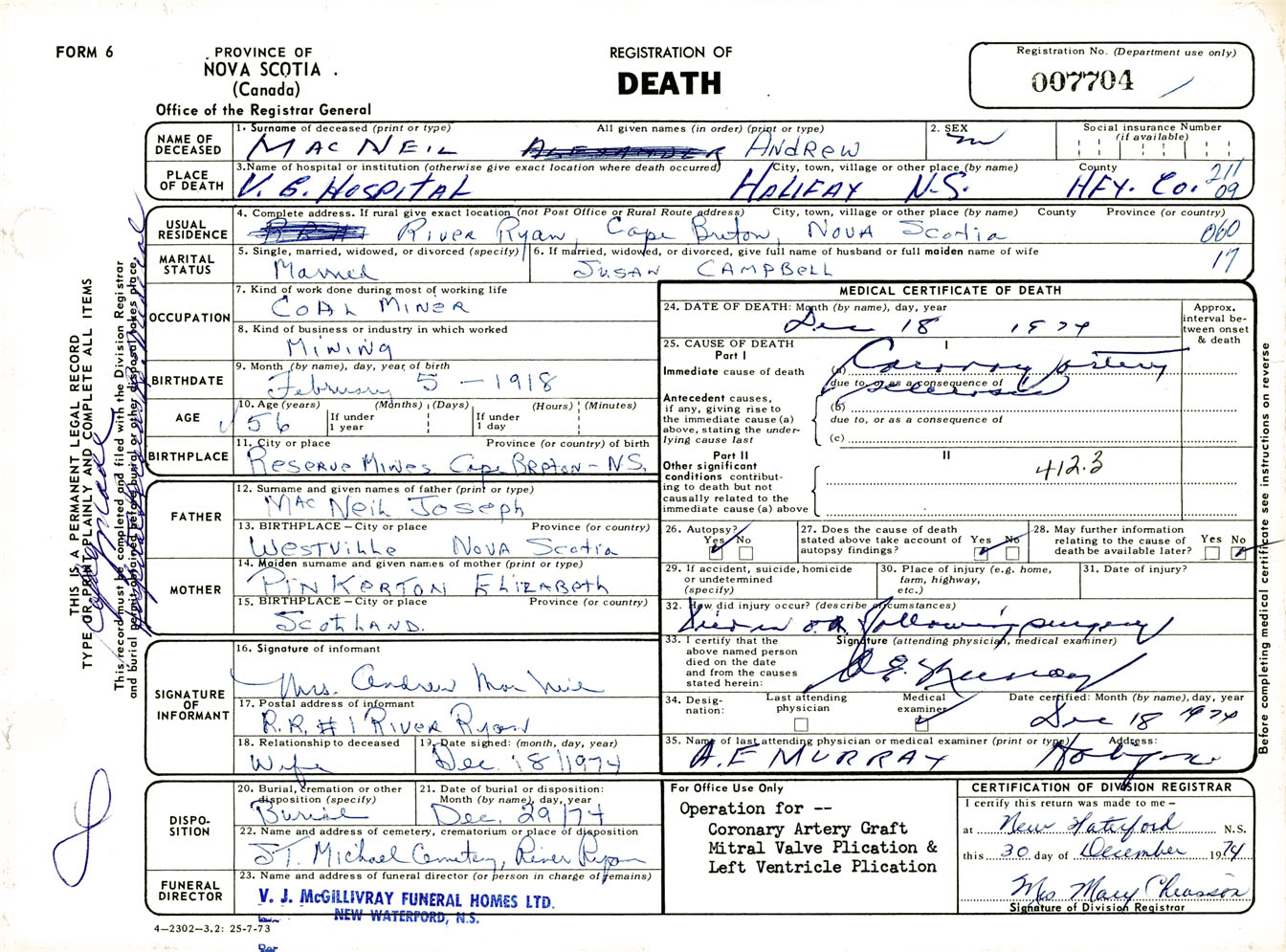 Male Death Registration: Year: 1974 number: 7704