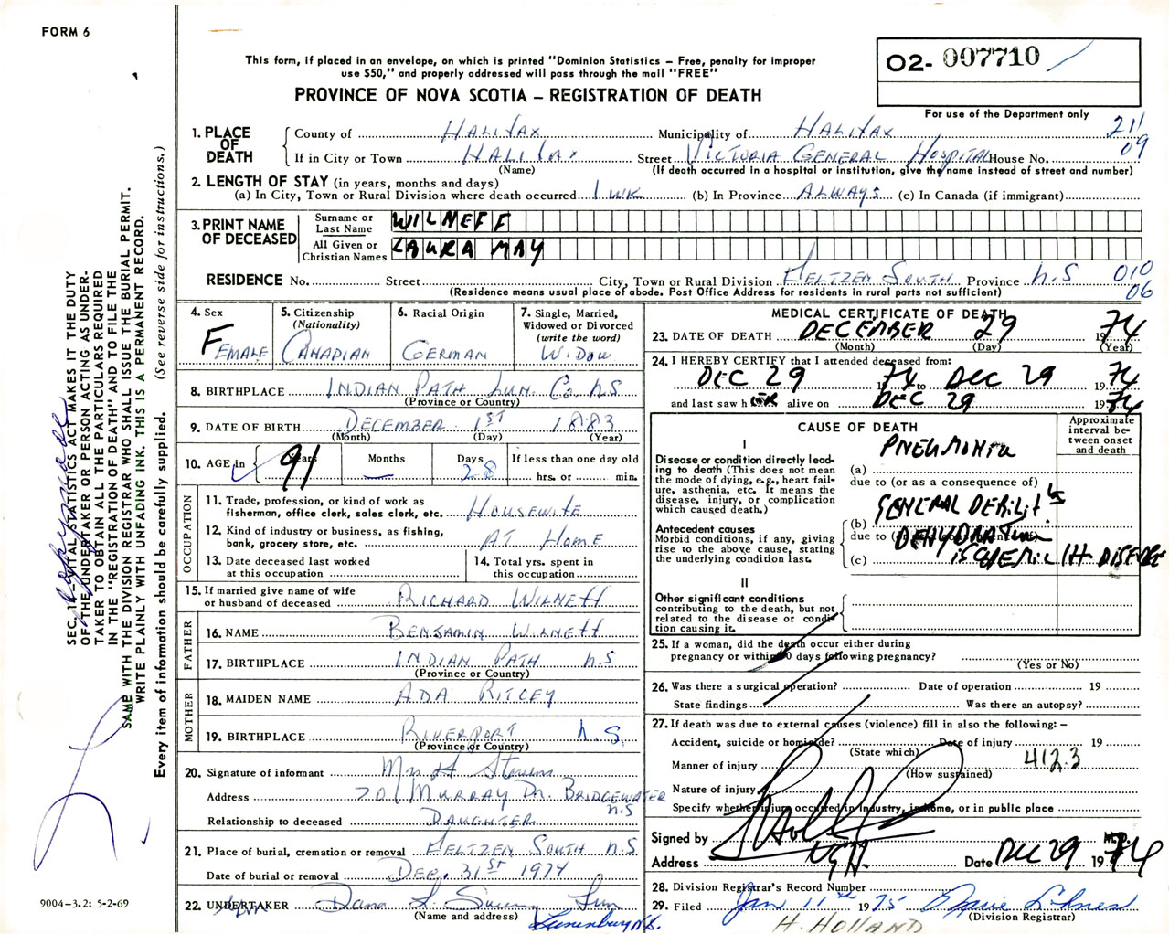 Female Death Registration: Year: 1974 number: 7710