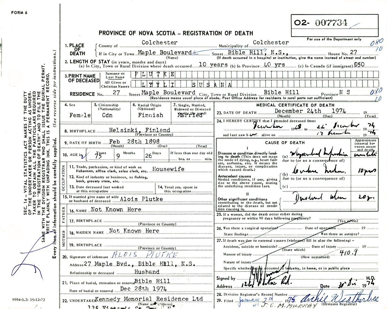 Female Death Registration: Year: 1974 number: 7734