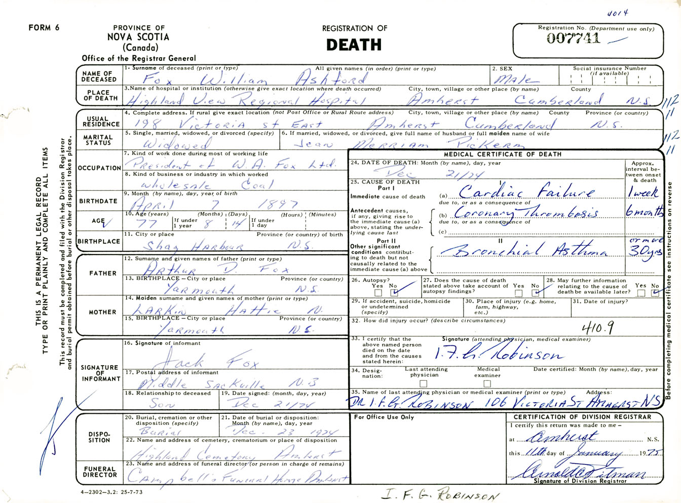Male Death Registration: Year: 1974 number: 7741