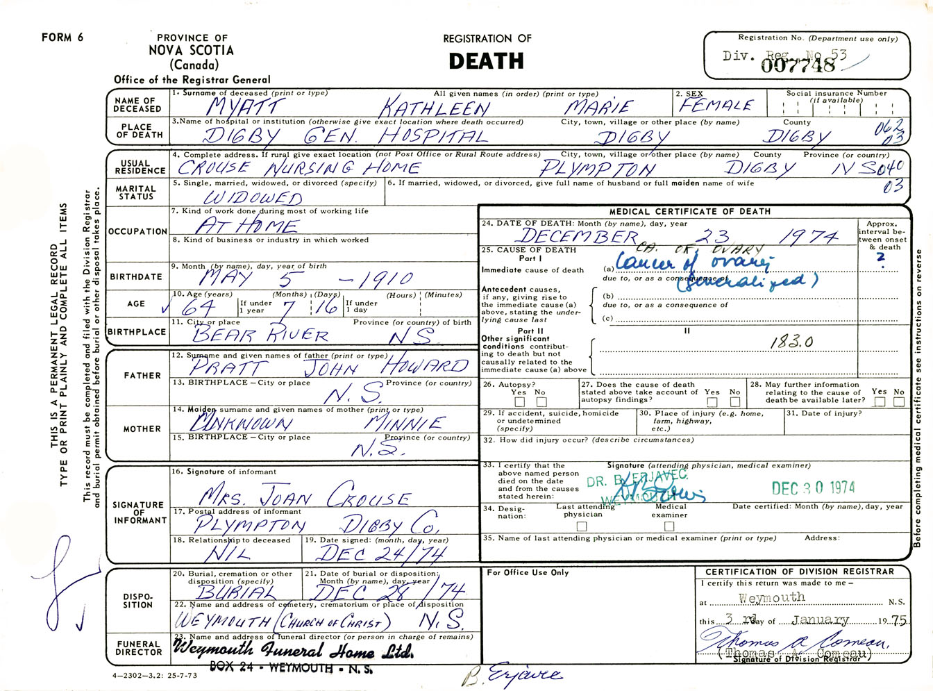 Female Death Registration: Year: 1974 number: 7748