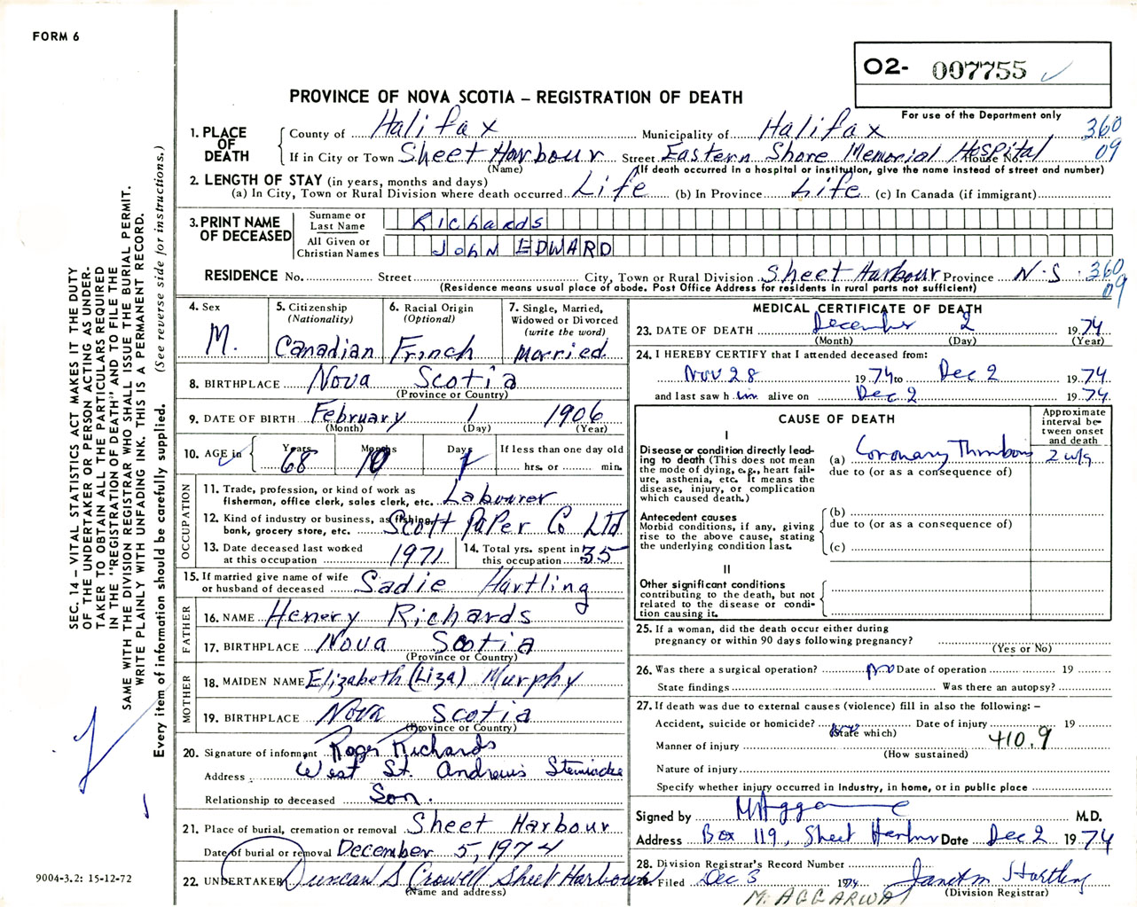 Male Death Registration: Year: 1974 number: 7755