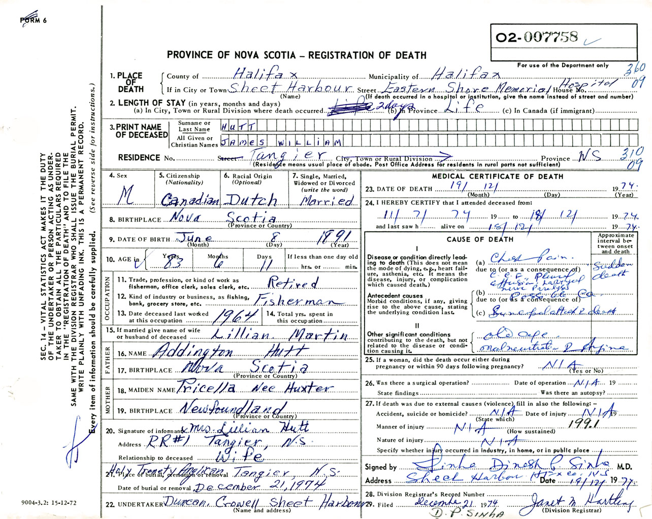Male Death Registration: Year: 1974 number: 7758