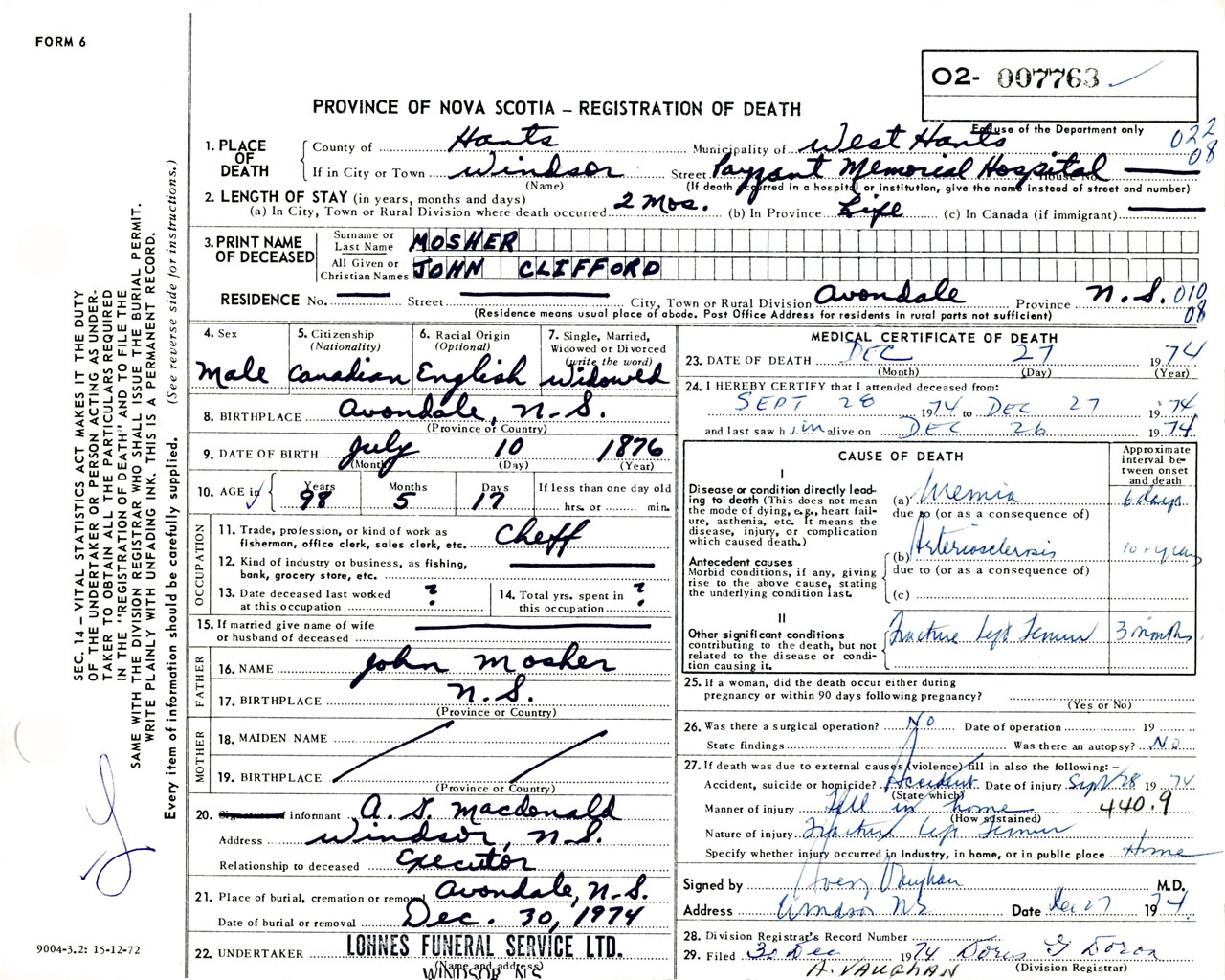 Male Death Registration: Year: 1974 number: 7763