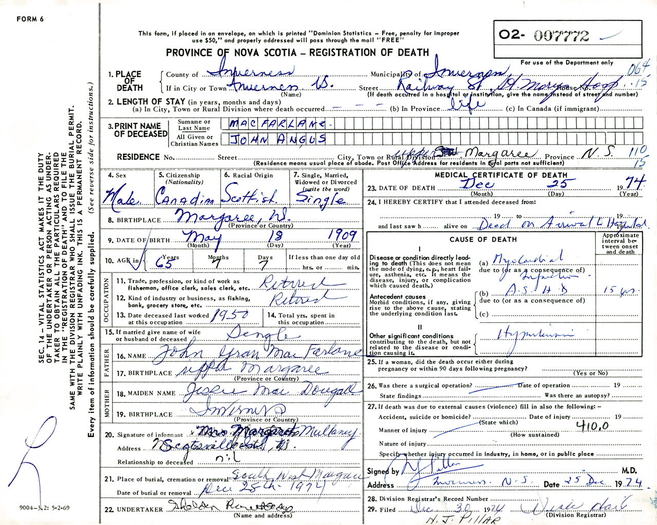 Male Death Registration: Year: 1974 number: 7772
