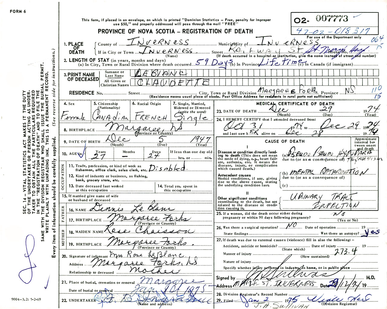 Female Death Registration: Year: 1974 number: 7773