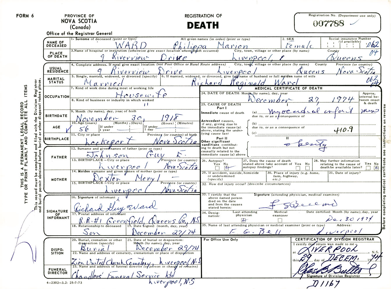 Female Death Registration: Year: 1974 number: 7788
